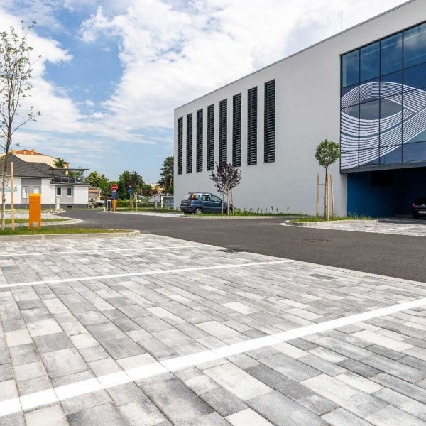 A kombinált csomagolással, 5 különböző méretben és két burkolási szélességgel rendelkező Leier Patria térkő esetében a szigorú vonalvezetést ötvözték a játékos burkolatképpel.